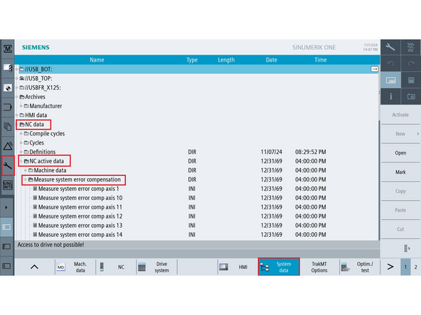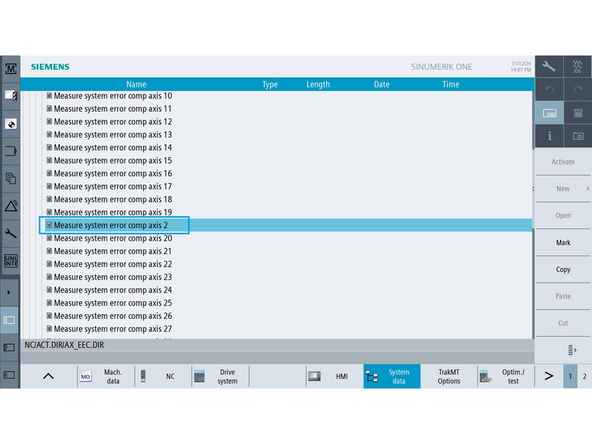 Go to [Setup] → [System Data] → [NC data] → [NC active data] → [Measure system error compensation].